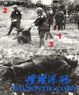 • 南京大屠杀刽子手谷寿夫被执行枪决(图中所示的编号是押送谷寿夫的三名国军士兵。)